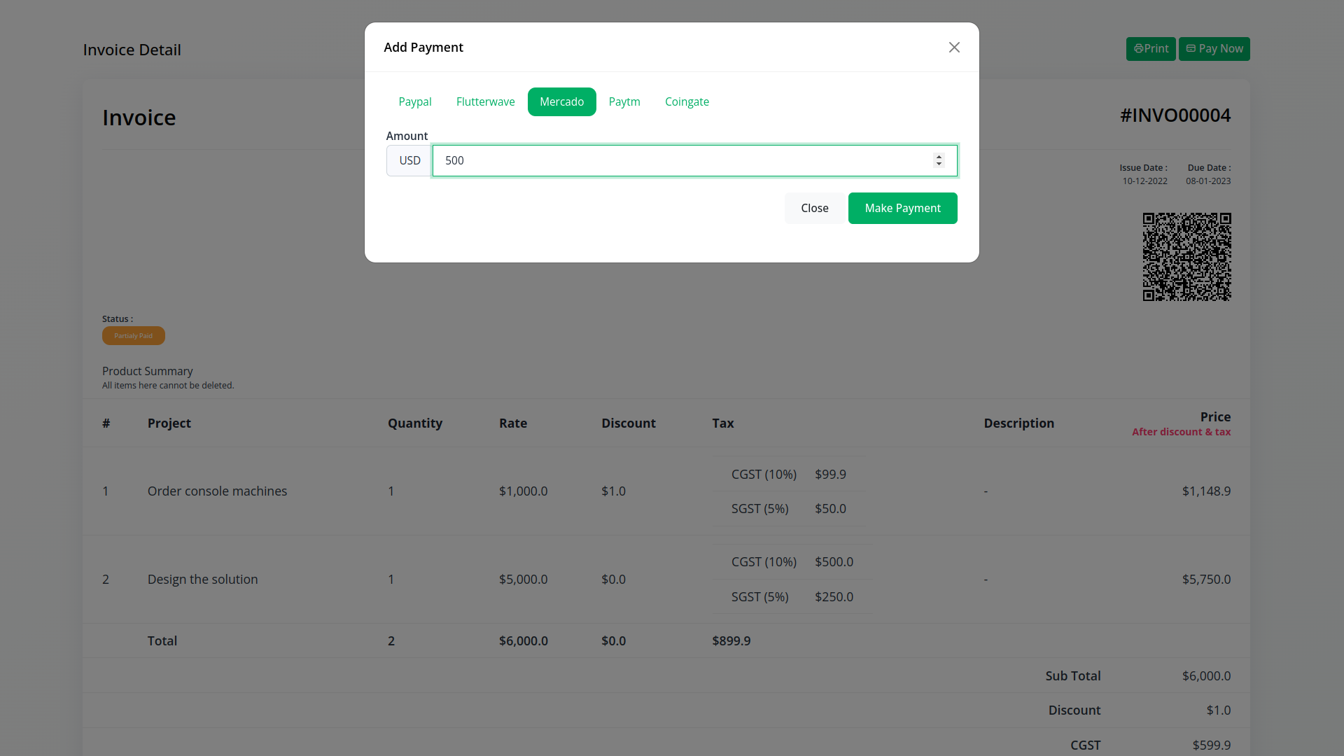 Mercado Pago is an online payment platform that allows Zoho Invoice users to receive and process payments quickly and securely. Once you share the invoice link with your customer, they can make payments through multiple payment modes such as debit/credit cards, cash, and red link transfers.